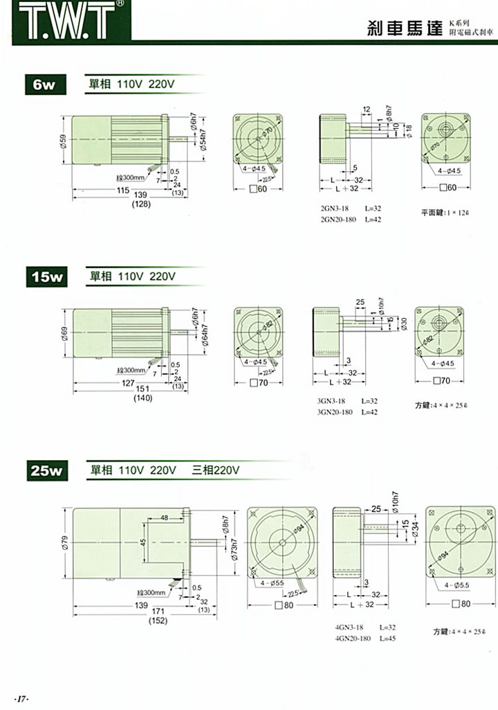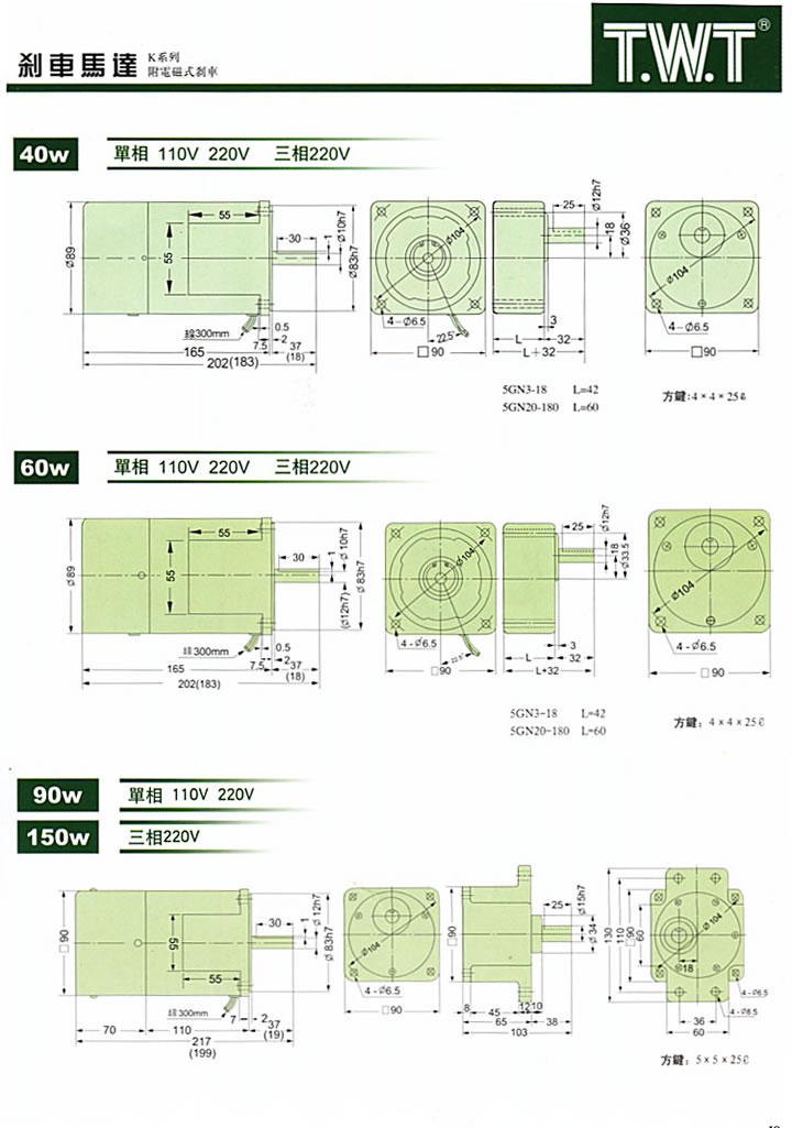 單相付電磁剎車馬達馬力:6W~150W電壓:100V~110V;200V~220V三相付電磁剎車馬達馬力:25W~150W電壓:200V.220V.380V.440V特長: * 確實地保持負載:既為無激磁動作式電磁制動器,剛關掉電源時,立即產生制動力而確實地保持負載。 * 短時間內制動:電動機單機時,超程是2~4旋轉。